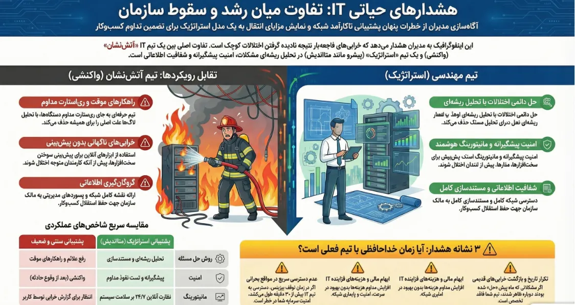 اگر تیم پشتیبانی شما برای یک مشکل خاص چندین بار در ماه فراخوانده میشود و هر بار با یک راهکار موقت (مثل خاموش و روشن کردن دستگاه) شعله را خاموش میکند، شما با یک تیم آتشنشان روبرو هستید، نه یک تیم مهندسی پیشرو.
